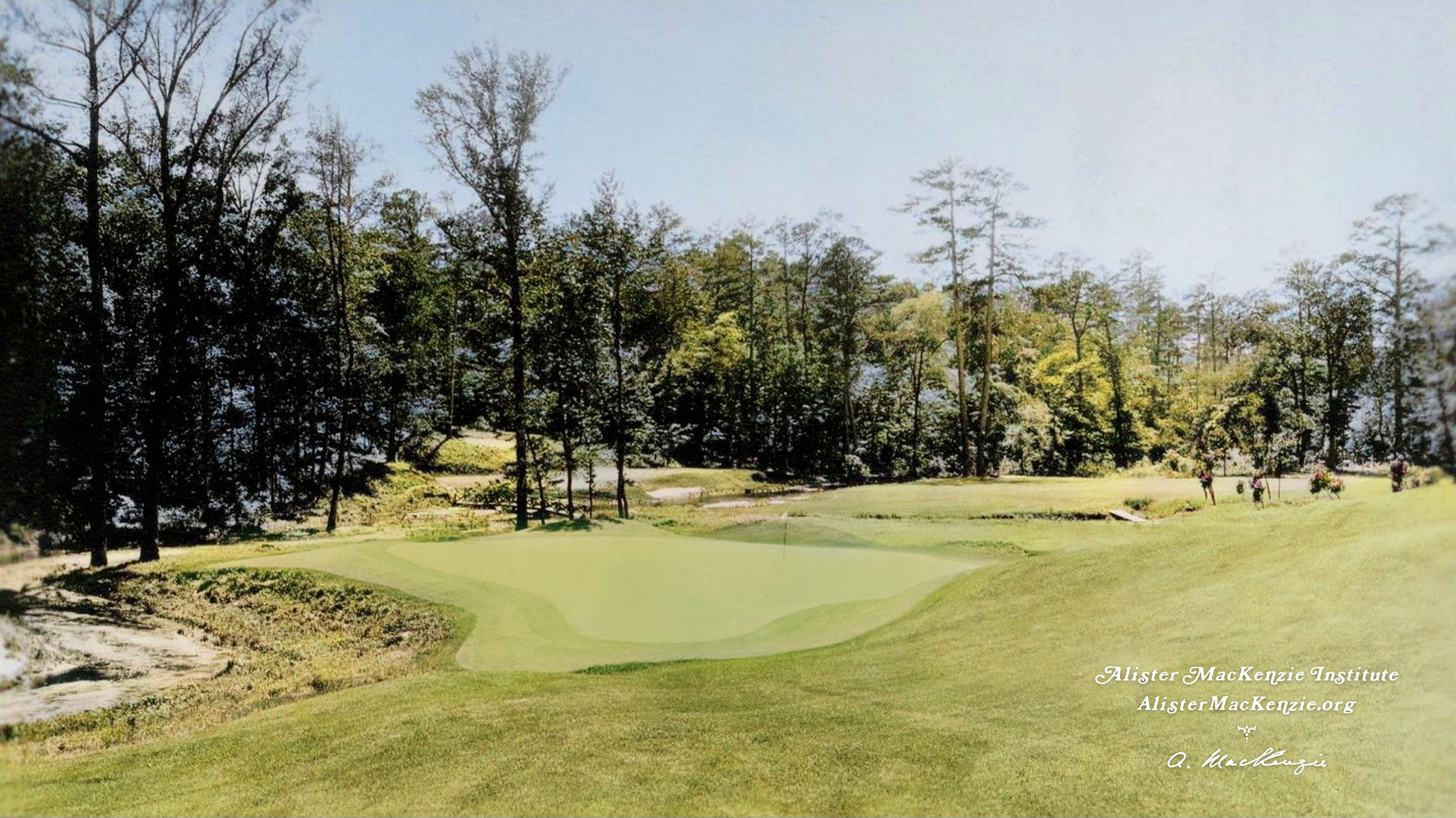 Alister MacKenzie (1932): “The green is situated in the bend of a stream. The approach has a marked tilt upwards from left to right, so that the further and more accurately a drive is placed to the left the easier the second shot becomes. This should always be a most fascinating hole. I don’t know another quite like it.”