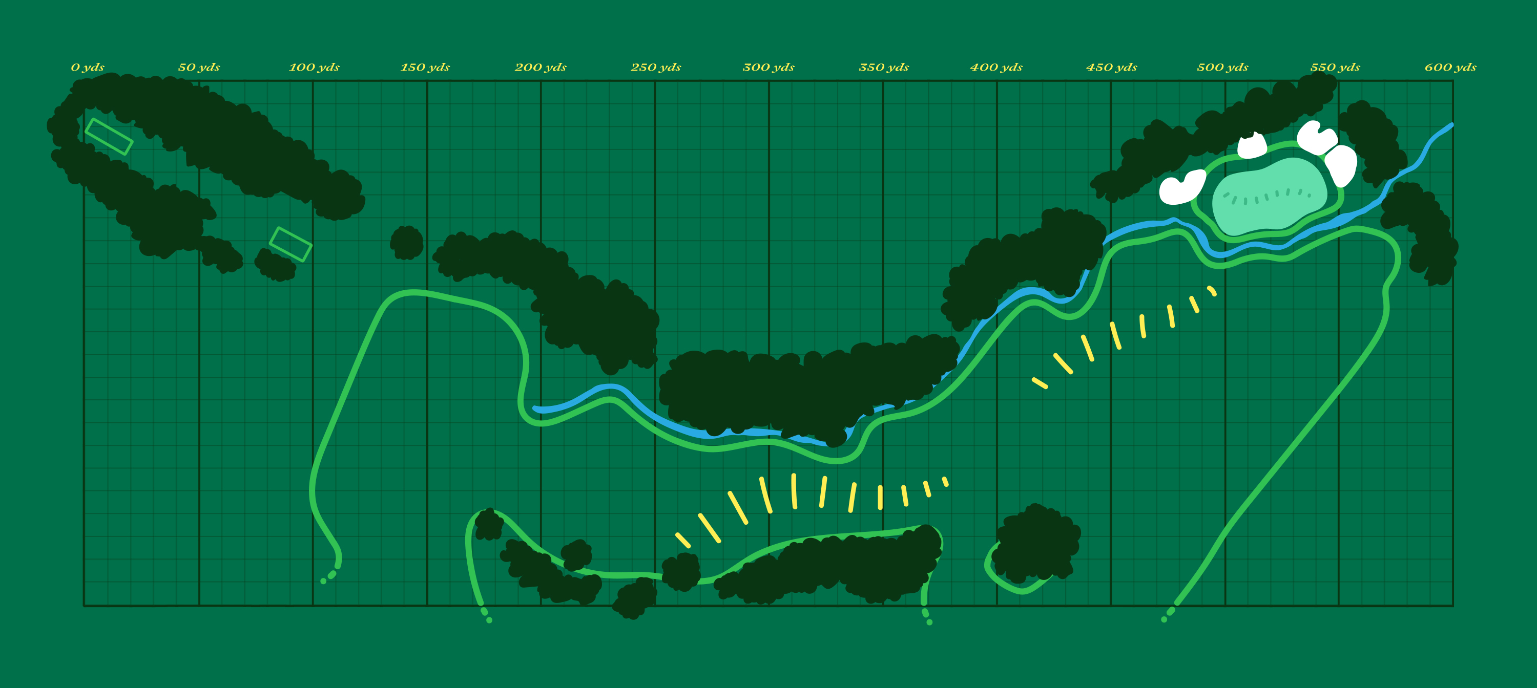 Geoff Ogilvy (2019): “It’s probably the perfect golf hole, and if it isn’t the perfect golf hole, it’s as close as you can get to a perfect golf hole. Strategically, the closer to the water you get, you get a three-fold advantage. You get a flatter lie, you’re closer to the green, and you have a better angle. The further away from the creek you are, the further away from the hole you are, the further the ball is above your feet, the worse your angle into the green…. It’s incredible how much the ball is above your feet on that second shot. It’s hard to hit it high, and because the trouble is short left and [the creek] goes long right. If it was a flat lie, you’d want to hit a fade into that green, because you could hit a shot that was basically never [at risk] of going in the water. You could start it left of the green, the shortest carry. You could hit a safe one and say, ‘Well, if I hit it straight, I’ll just miss the green left and I can kind of birdie from over there.’ But you have to, with the ball above your feet, kind of hit a draw. So you’re hanging it over the long carry and you’re hanging it over the water. You’ve got this shot where all you want to do is hit a high fade and all the stance wants to give you is a low draw.”