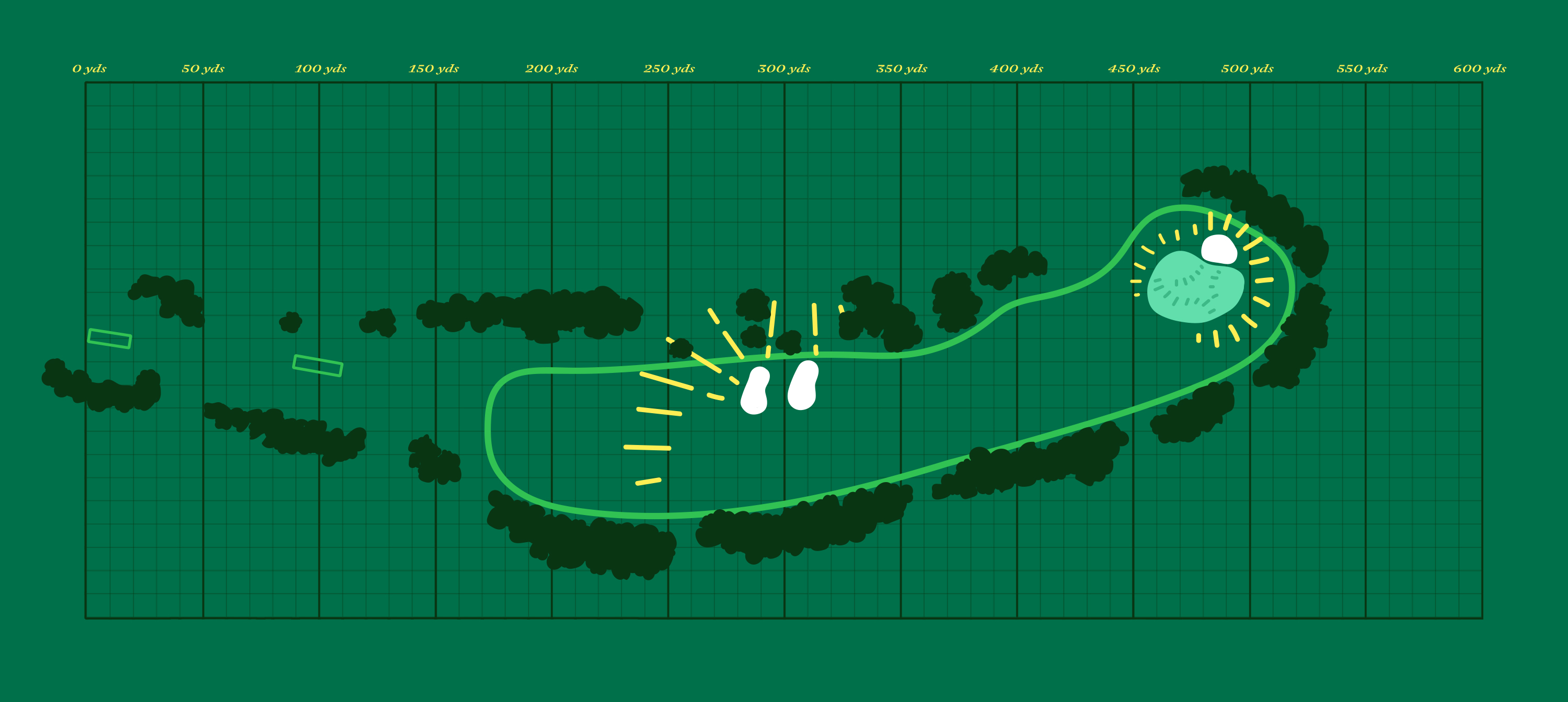 The long par-4 fifth hole curves left, following the crest of a ridge at the western end of Augusta National's property. (This ridge was carved by an extended tributary of Rae's Creek, which the club dammed in 1948 to create the pond on the 16th hole and finally eliminated in 1953 to allow for better spectator flow.) The inside of the dogleg is guarded both by a drop-off into a wooded area and two massive bunkers. Players who challenge this treacherous left side gain a substantial distance advantage and get to approach the green more directly into its primary slopes. The green bears a vague resemblance to C.B. Macdonald's Double Plateau template, with a pair of platforms for tough pins middle-left and back. Alister MacKenzie cited the Road hole as an inspiration, though aside from the risk-reward dogleg and the green's placement on a natural shelf, the resemblance is limited.