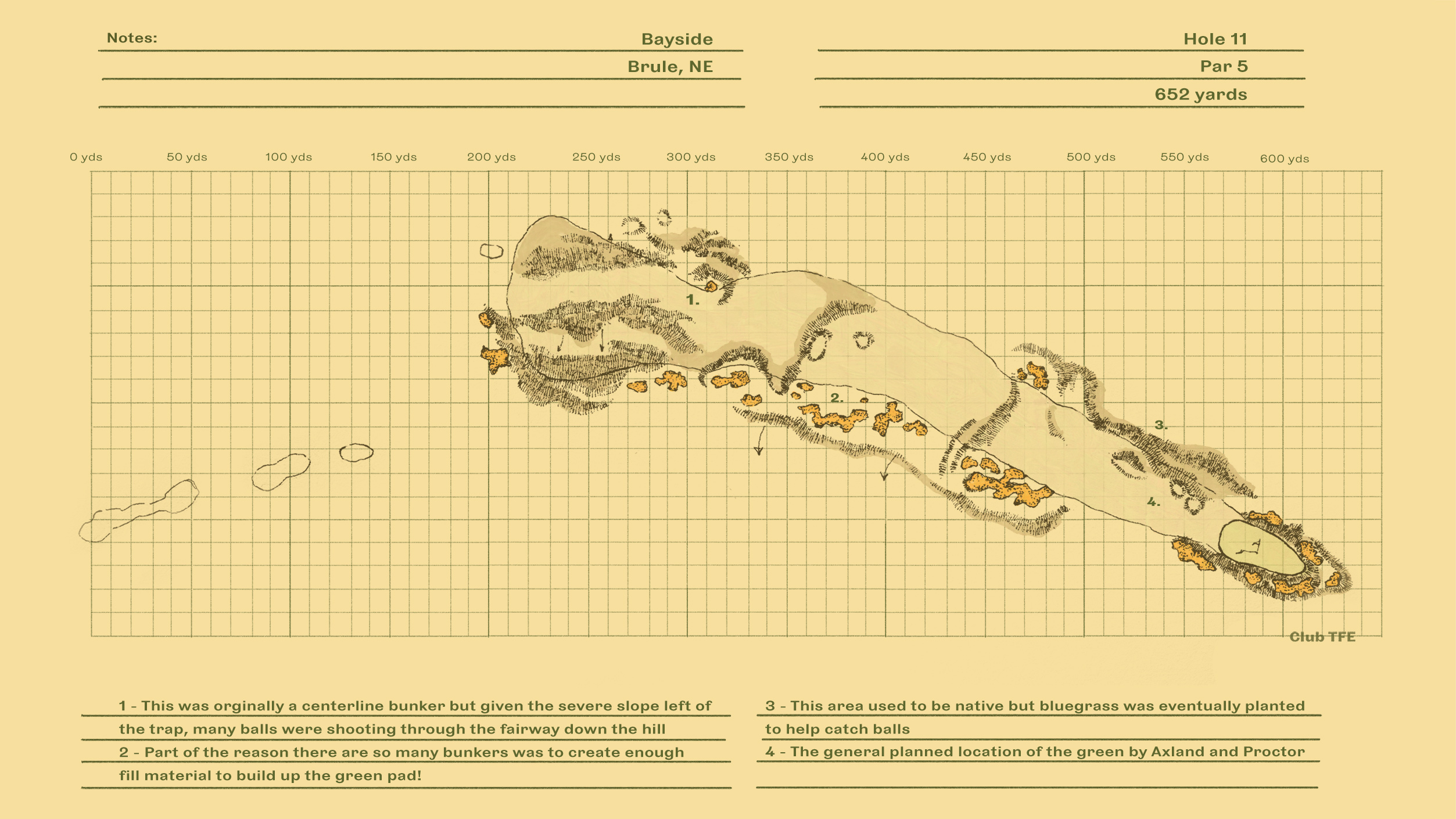 Marina. While the project scope was originally just nine holes, a co-owner wanted a proper 18-hole golf course after seeing the success of the front nine. The only problem was they didn’t have the most suitable land to do so. That led to the idea of dredging a large marina in Lake McConaughy and using the sandy dredgings to “soften” the severe land, or in other words, fill in some of the ravines to reduce the amount of forced carries. This was a great idea in theory but never came to fruition and led to a ferocious back nine with several long forced carries.