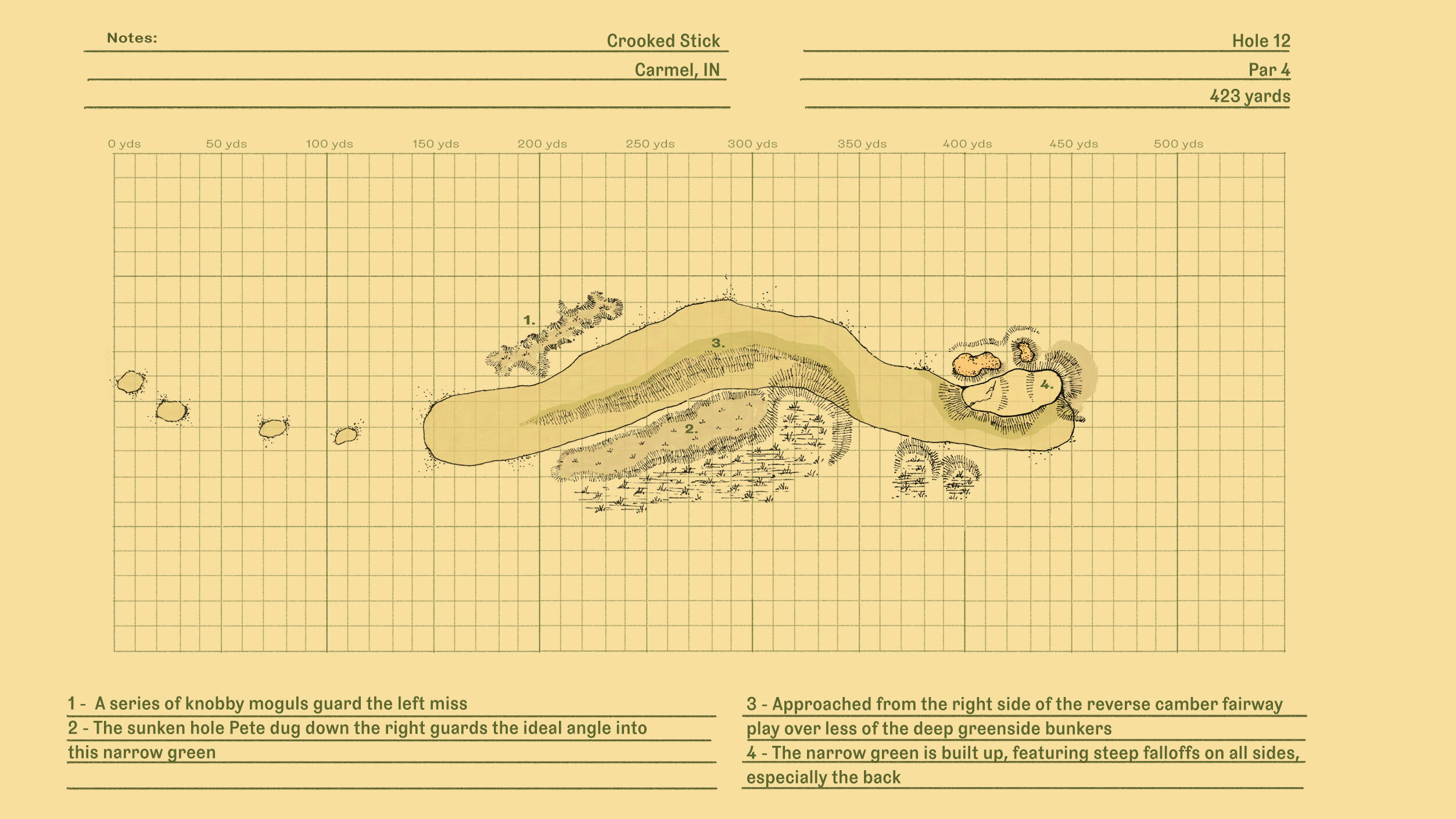 “Pete and I both admired the architecture. We wanted 12 at Crooked Stick to look like the fifth at Maxinkuckee Country Club. We liked the way it just dropped off to nothing behind the green. We intended it to be a replica of the fifth green at Maxinkuckee.” –Alice Dye