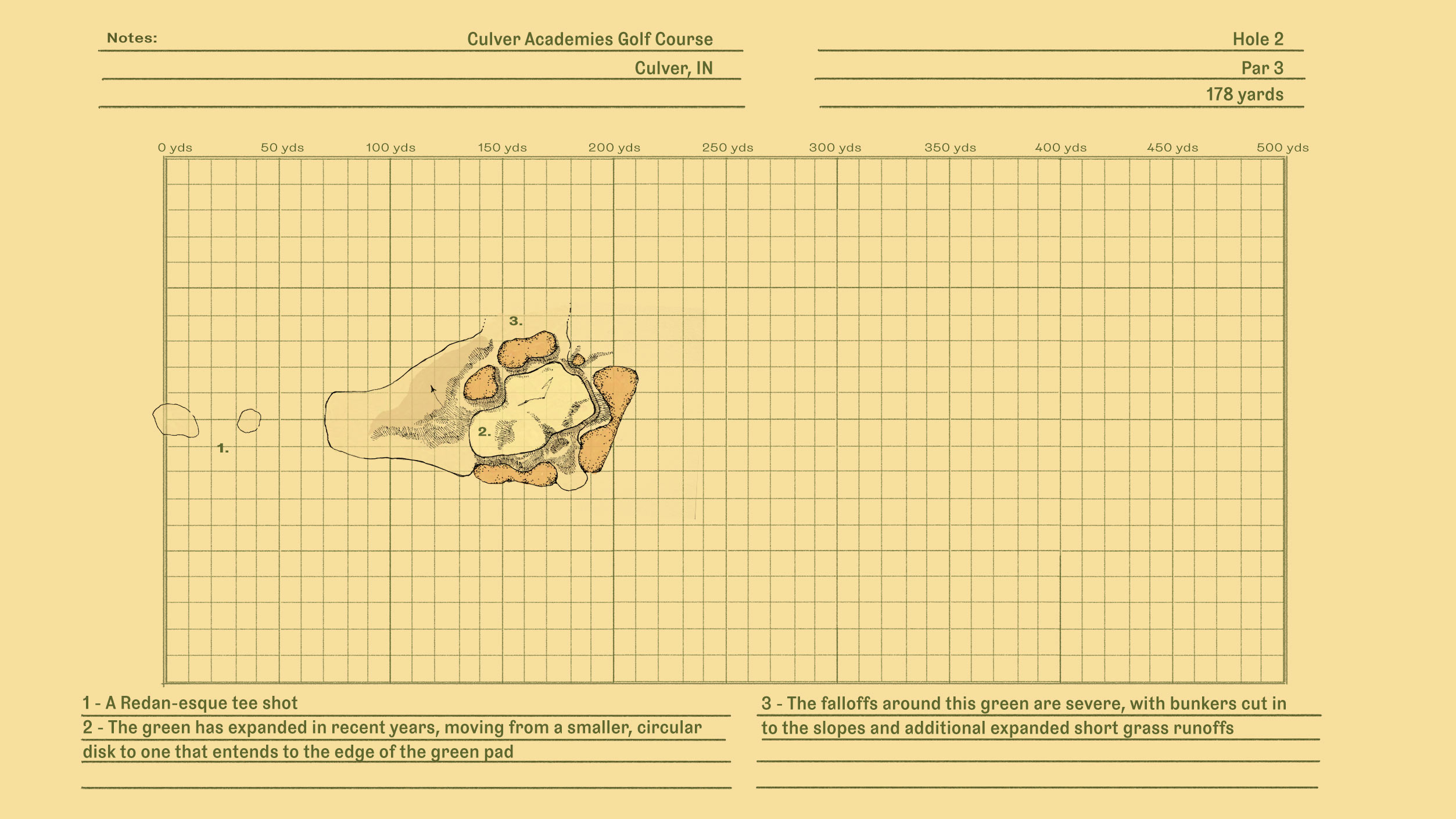 One thing that is comparable in this hole is the Redan-like qualities. The large shoulder front right of the green allows for shots to funnel onto the putting surface from right to left. A central knob can divert balls to the back right corner or back left corner, depending on how the ball enters the surface. The hole certainly has a resemblance to the seventh at Chicago Golf Club – built just prior to Culver – and makes me wonder if the Chicago-based team had seen what Seth Raynor did in Wheaton prior to building the second at Culver. This green has been expanded to the max, allowing for a myriad of epic pin positions and optionality. Unambiguously, a first-class par 3.