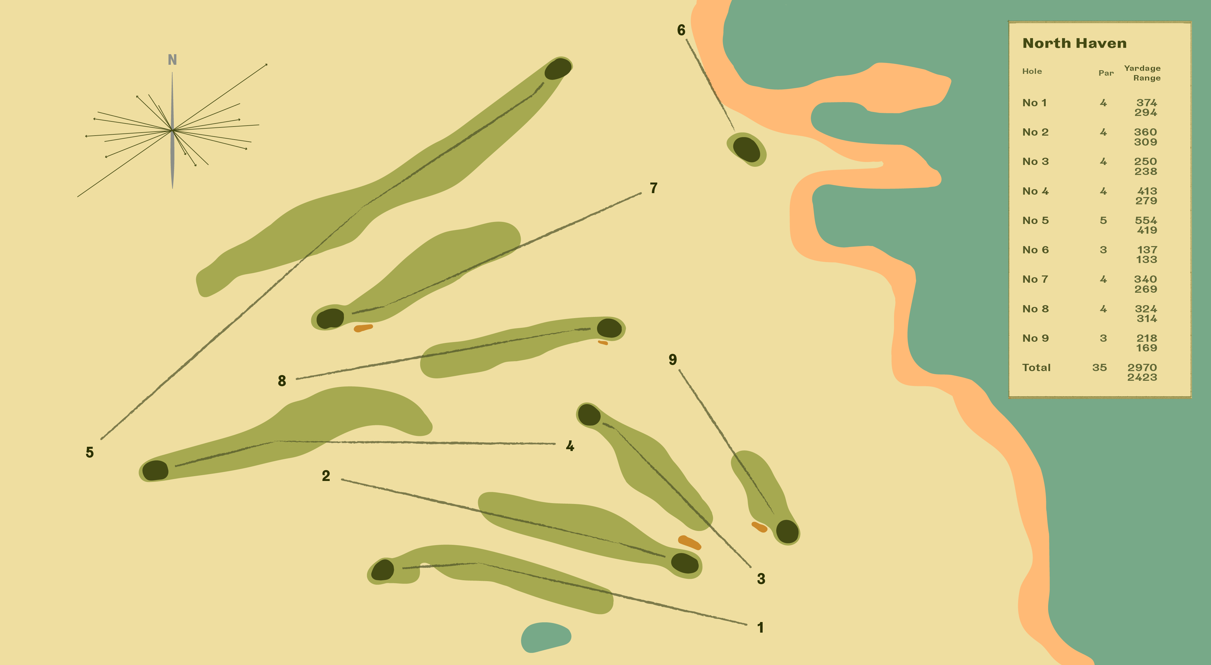 Fine, sloping land, a seaside location, and strong design lineage make North Haven a lovely round of golf for adventurous golfers