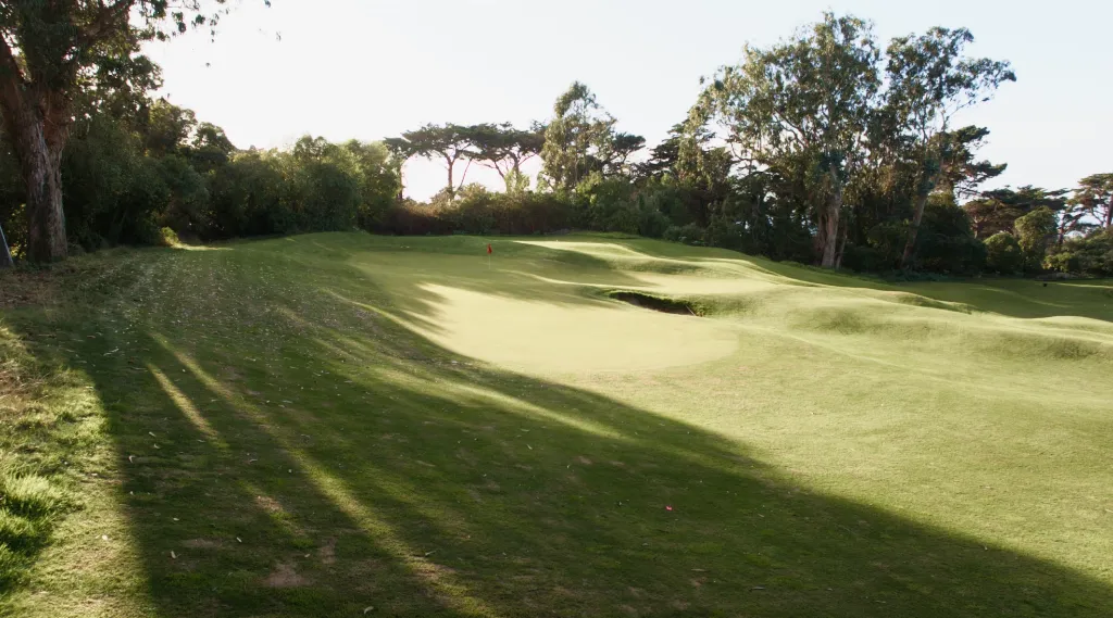Here's a more aerial view of the entire green. If you choose, you can run shots into the green using the ground and mounding on the left to feed balls hard to the right.