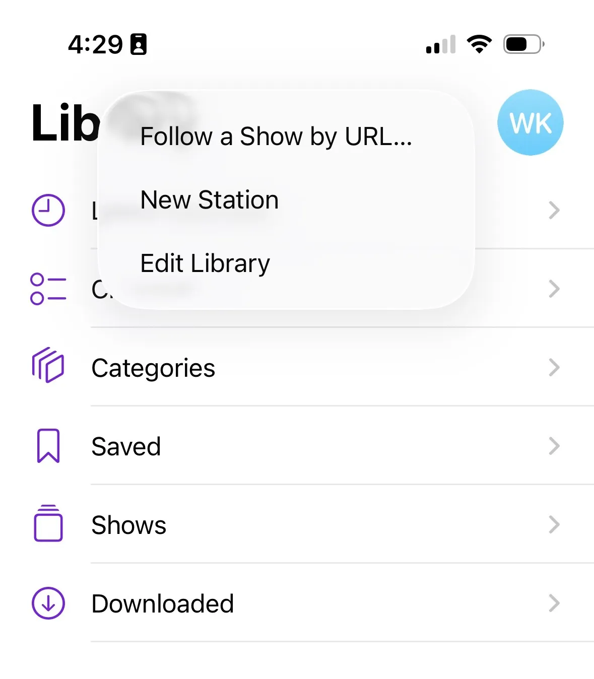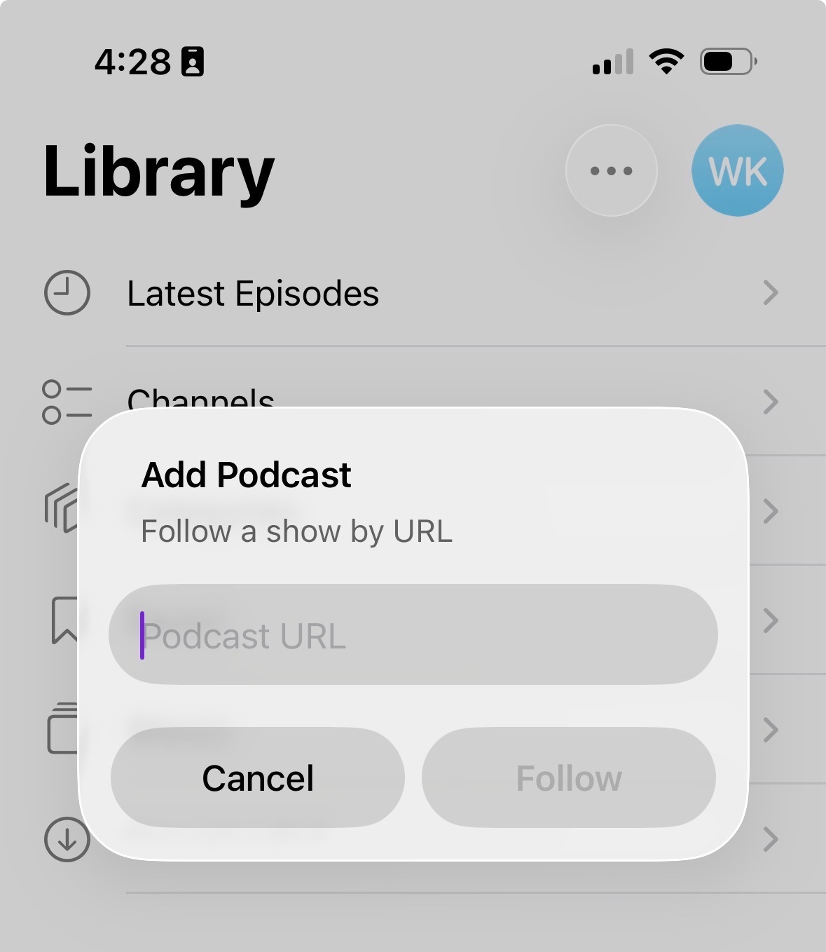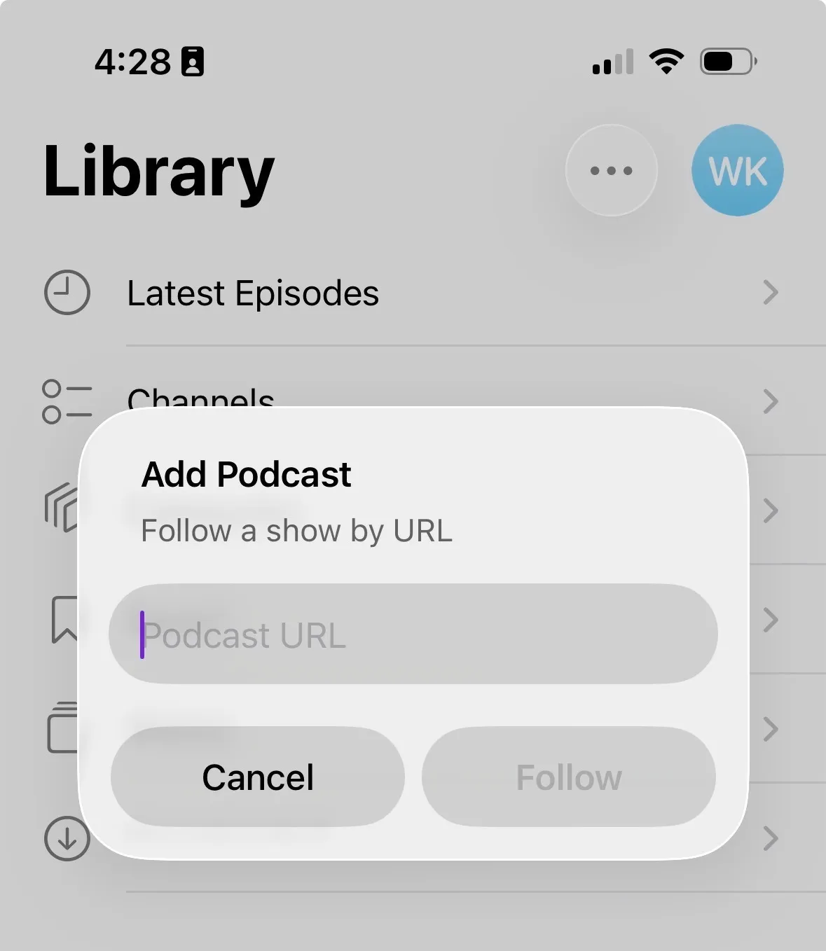 In your Podcasts app, click on “Library.” Click on the ellipsis at the top and click “Follow a Show by URL…” from the dropdown. Paste the above URL into the pop-up.