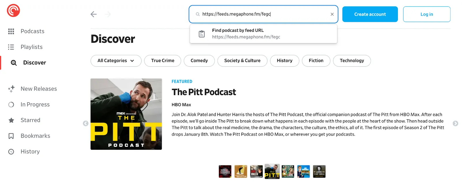 Go to the Discover tab in Pocket Casts and paste the above URL into the search field. The podcast should appear in the results.